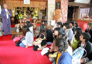 “四國大島心靈故鄉(xiāng)會”矢野都林會長首先在村上水師的菩提寺和高龍寺(今治市吉海町名)迎接了大家,并給大家介紹了四國大島的基本情況;隨后,留學生們步行6公里,走訪了38所名剎;夜里,大家就寄宿在島上的民居旅館“善根驛站”,晚餐則品嘗到了島上志愿者親手制作的美味。