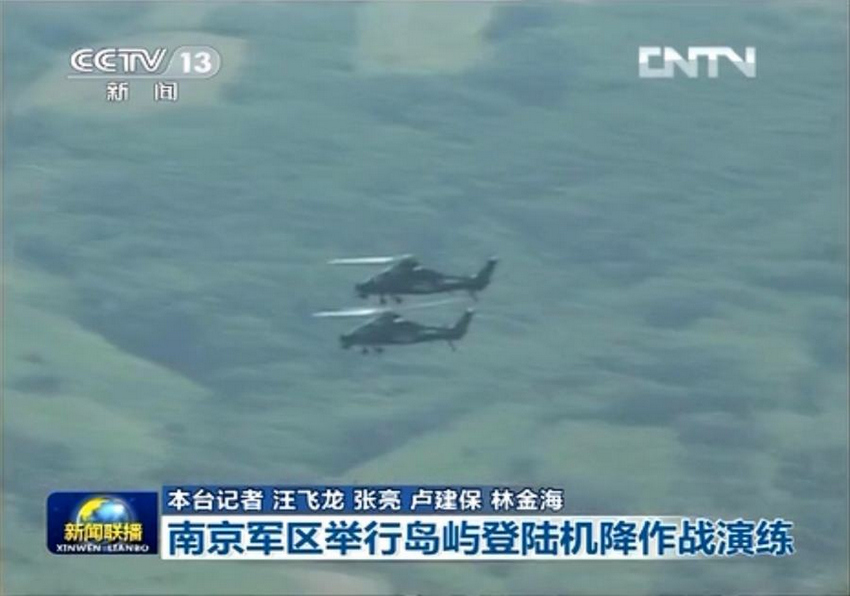 近期,日本“購(gòu)島”行徑引發(fā)釣魚島問題持續(xù)火熱。2012年10月15日的中央電視臺(tái)新聞聯(lián)播節(jié)目,播出了南京軍區(qū)舉行島嶼登陸機(jī)降作戰(zhàn)演練的視頻,這段視頻持續(xù)1分多鐘,顯示演練場(chǎng)面火爆,南京軍區(qū)出動(dòng)了登陸艦、大批火炮、米-17、直-9WZ等裝備,引人注意的是,網(wǎng)絡(luò)上軍迷極其關(guān)注并熱切期待的武直-10攻擊直升機(jī),出現(xiàn)在視頻當(dāng)中,視頻顯示,武直-10發(fā)射火箭彈發(fā)起攻擊。(來源:環(huán)球網(wǎng))