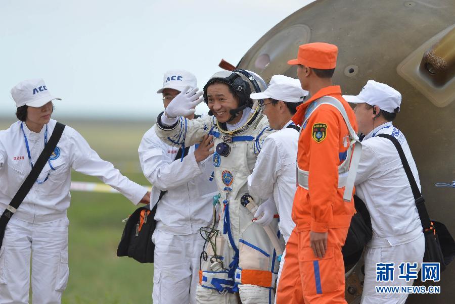 6月26日,航天員聶海勝自主出艙后揮手致意。當(dāng)日,神舟十號載人飛船返回艙在內(nèi)蒙古主著陸場成功著陸,3名航天員身體狀況良好。天宮一號與神舟十號載人交會對接任務(wù)取得圓滿成功。新華社記者 張領(lǐng) 攝 圖片來源:新華網(wǎng)