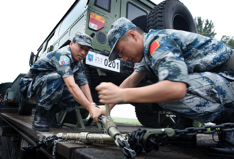 空軍戰(zhàn)斗群地轉(zhuǎn)人員在中轉(zhuǎn)途中加固裝備。曹占禮 攝