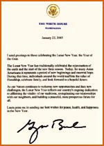 布什總統(tǒng)二十九日發(fā)布賀詞說,農(nóng)歷新年的傳統(tǒng)是慶祝大地復(fù)蘇和新的耕作時(shí)節(jié)的開始。如今,對(duì)于許多美國亞裔來說,它標(biāo)示著新開端和新希望的降臨。在這段時(shí)間里,世界各地的人們重新確認(rèn)友誼的價(jià)值,慶祝家庭團(tuán)圓,期待著一個(gè)充滿希望的未來!