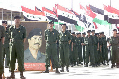 在一個(gè)插滿稱贊薩達(dá)姆的旗幟的體育場(chǎng)上,許多貴賓和學(xué)生在觀看數(shù)萬(wàn)名軍人照著軍樂隊(duì)的節(jié)拍列隊(duì)行進(jìn),時(shí)間達(dá)兩個(gè)多小時(shí)。這些士兵一面行進(jìn),一面揮舞各式武器,其中包括步槍和火箭筒。