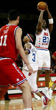 對球迷而言,這場比賽具有雙重的意義。一方面,中國球員姚明在自己的NBA第一個賽季就以首發(fā)陣容出戰(zhàn)這代表NBA最高榮譽的比賽;另一方面,NBA歷史上最偉大的球星“飛人”邁克爾-喬丹很可能是最后一次參加全明星賽,他在比賽中只要得到11分,還可以超越“天鉤”賈巴爾成為全明星比賽中的第一得分王。
