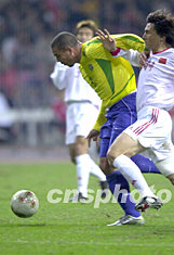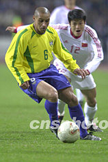 巴西隊排出三五二陣容,依靠“三R”組成銳利的鐵三角力圖控制中場,中國隊則擺出四五一陣容,采用中場密集攔截的戰(zhàn)術(shù)布置,瓦解巴西隊的進(jìn)攻。開場后十五分鐘內(nèi),雙方互相試探,攻勢平平,只是巴西隊在十二分鐘時,右路連續(xù)獲得兩個角球機會,才掀起一絲波瀾。三十分鐘時,巴西隊在進(jìn)攻左前方獲得直接任意球機會,里瓦爾多一記漂亮的弧線球繞過中國隊人墻,直奔球門左側(cè),幸被中國隊門將劉云飛撲出。
