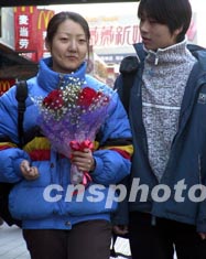 北京姑娘在“情人節(jié)”當天得到男友一束鮮花。這一天,在西單商業(yè)街,這種場面比比皆是。作者:鄒憲