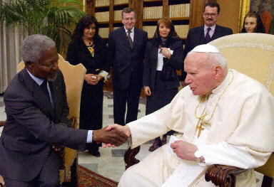 抵達(dá)羅馬參加聯(lián)合國(guó)發(fā)展署有關(guān)會(huì)議的聯(lián)合國(guó)秘書(shū)長(zhǎng)安南與羅馬天主教皇約翰保羅二世舉行了長(zhǎng)達(dá)30分鐘的會(huì)談。
