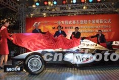 參加2003年世界F1比賽的麥克拉倫·梅賽德斯車隊的新型賽車,24日在北京揭幕亮相,隨著2004年世界F1比賽進入中國上海國際賽車場,國際各個大牌車隊都將在中國進行展示。作者:趙振清