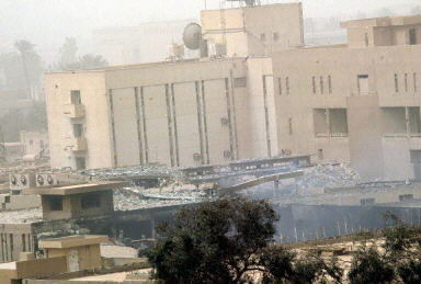 3月26日,美英聯(lián)軍再次轟炸巴格達,伊拉克國家電視臺在空襲中被炸。