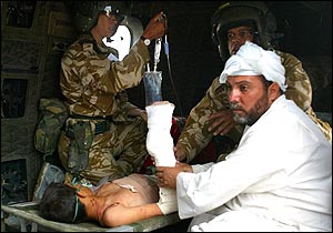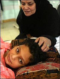 三天前,阿里對泰晤士報(bào)記者說,他最喜歡的學(xué)科是地理,因?yàn)樗肼眯。昨天他忍著巨大的疼痛轉(zhuǎn)頭向他叔叔問:“我是不是很快就能旅行了?”他叔叔說他不但很快就能旅行,而且還能去捕魚。阿里家住巴格達(dá)東南部,在一次轟炸中他的床單著火,他自己火燒傷。在這次事故中,他的父母也雙雙死于這次襲擊,當(dāng)時(shí)他母親已經(jīng)懷孕5個(gè)月。另外,他的兄弟和幾個(gè)姐妹也遇難。