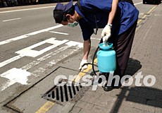 在香港“復(fù)活節(jié)”假期,全民總動(dòng)員清潔香港預(yù)防病毒蔓延,21日衛(wèi)生部門派出人員消毒馬路污水渠道。洪少葵 攝