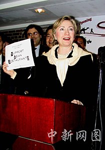 紐約州聯(lián)邦參議員希拉里. 克林頓五日到訪紐約華埠,手舉“支持亞洲餐館”的標(biāo)語(yǔ),支持華埠商家。中新社記者 趙海燕 攝