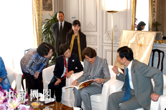 拉法蘭總理夫人一進(jìn)大門,就對迎候的中國駐法大使吳建民和夫人施燕華公參說:“訪問中國是我的一個愿望。由于中國目前發(fā)生的特殊情況,我沒能于上月隨同丈夫一起訪華,感到非常遺憾。今天我把原本要一同訪華的所有夫人們帶到這里,參觀巴黎的中國---新近成立的巴黎中國文化中心,也是了卻一個心愿!