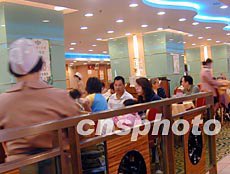 世界衛(wèi)生組織解除了對香港發(fā)出的旅游警告,使一度沉寂的酒樓食肆霎時熱鬧起來.圖為市民在周末除下口罩享受美味佳肴.中新社傳真 洪少葵 攝