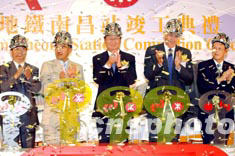 香港九廣鐵路公司主席田北辰,6月2日帶領(lǐng)嘉賓參觀竣工的南昌站大堂控制室,該站是地鐵網(wǎng)絡(luò)的一個(gè)全新車站,將于2003年秋季投入服務(wù)。