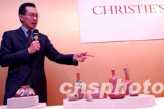 香港佳士得2003年春季拍賣會6月26日展示康熙宮廷御制文玩“大八碼”豆紅瓷器,估價二百五十萬港元。中新社記者 洪少葵