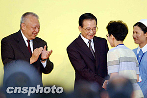 國務(wù)院總理溫家寶6月30日出席表揚(yáng)醫(yī)護(hù)人員成功抗炎大會(huì),向在抗擊SARS中以身殉職的醫(yī)護(hù)人員家屬表示慰問。洪少葵 攝