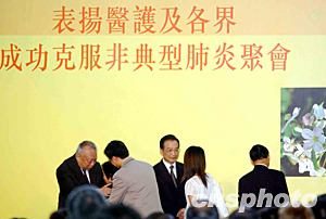 國務(wù)院總理溫家寶6月30日在香港表揚(yáng)醫(yī)護(hù)人員成功克服SARS聚會(huì)上,表彰醫(yī)護(hù)界、科研界、志愿機(jī)構(gòu)、政府部門和學(xué)校的代表,并慰問因公殉職的謝婉雯醫(yī)生、護(hù)士劉永佳等家人。洪少葵 攝