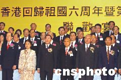 中新網(wǎng)7月4日電 香港廣東社團(tuán)總會(huì)昨晚在香港會(huì)議展覽中心五樓大會(huì)堂隆重舉行“慶祝香港回歸祖國六周年聯(lián)歡宴會(huì)”。全國政協(xié)副主席霍英東﹑行政長(zhǎng)官董建華等蒞臨主禮。