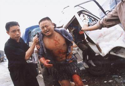 在現(xiàn)場,聚集在受損最為嚴(yán)重的川M05049小貨車周圍的司機(jī)此刻也動手救助卡在駕駛室里的同行。要救人就必須移開小貨車前面那輛大貨車,但它已經(jīng)無法發(fā)動,“我來試試!”排在第一的東風(fēng)大貨車司機(jī)從破裂的車窗翻進(jìn)駕駛室,汽車被發(fā)動了!車輪在一厘米一厘米地前移,因猛烈撞擊已經(jīng)交錯纏繞在一起的車體鋼板發(fā)出分離時的撕裂聲,川M05049已成麻花的駕駛室漸漸被移動的前車扯高,當(dāng)最后一塊鋼板脫離時,駕駛室轟然落下,被卡的3名傷者同時高聲喊疼。7時42分大家奮力拉開變形車門,將馬偉和劉德志抱出了險境。重傷者記者鼓勵堅持下去
