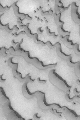 7月13日,來自美國國家航空和宇航局(NASA)的火星全球測量員(MGS)和火星衛(wèi)星照相機(jī)(MOC)的圖片顯示,火星北極冰冠附近的沙丘。冰冠被大片受風(fēng)吹蝕的黑暗沙丘包圍。