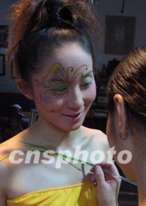 一名愛(ài)美的福州女子十八日欣然接受職業(yè)化妝師的彩繪裝扮。人體彩繪在福州成為一種時(shí)尚。作者:劉可耕