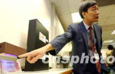 香港商業(yè)罪案調(diào)查科專家余社長,7月18日向新聞界講述偽鈔辨別方法。香港警方7月17日搗破了一個(gè)制造偽鈔的工場(chǎng),檢獲一批面值一百元的偽鈔和制造工具。中新社記者:洪少葵