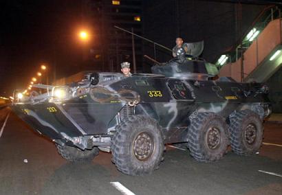 圖:菲律賓政府軍裝甲車圍住兵變士兵占領(lǐng)區(qū)