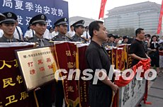 北京警方二十七日舉行“夏季治安攻勢(shì)追繳物品發(fā)還儀式”,部分被盜汽車失主取回汽車后向警方贈(zèng)送錦旗。中新社記者:任海霞
