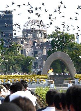 當(dāng)?shù)貢r(shí)間8月6日,日本廣島正在為美國(guó)原子彈轟炸廣島58周年而舉行紀(jì)念活動(dòng)。圖為在廣島的和平紀(jì)念公園,一群和平鴿飛向天空。