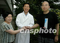 北京SARS醫(yī)療專(zhuān)家、人民醫(yī)院ICU主任安友仲教授,8月15日到北京地壇醫(yī)院祝賀將于16日出院的中國(guó)最后兩名SARS康復(fù)患者孫崢(右)、盧志艷(中)。安友仲教授曾在過(guò)去的三個(gè)月內(nèi)分別參予這兩名患者的轉(zhuǎn)院搶救治療。中新社記者:任晨鳴