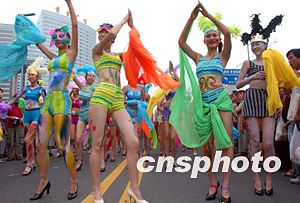 八月十七日下午,第十三屆青島國(guó)際啤酒節(jié)舉行盛大的狂歡巡游活動(dòng),由六十名女模特組成的“泳裝彩繪方隊(duì)”成為本次巡游活動(dòng)的最亮點(diǎn)。中新社記者:張煒