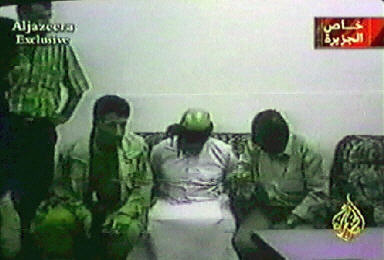 中新網(wǎng)8月21日電 “半島”電視臺(tái)新聞節(jié)目抓圖。畫面上為8月20日一名庫爾德戰(zhàn)士看守著薩達(dá)姆的得力助手--伊拉克副總統(tǒng)塔哈·亞辛·拉馬丹。庫爾德人于8月19日在摩蘇爾市的突襲行動(dòng)中抓獲了拉馬丹。拉馬丹在美軍55人撲克牌通緝令中名列第20位。至此,通緝名單上已有38人被捕或被擊斃。(春風(fēng))