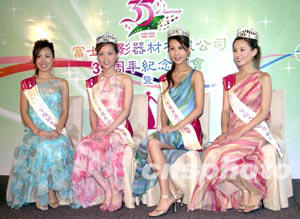 應(yīng)屆出爐港姐冠軍曹敏莉(右二)、亞軍楊洛婷(右一)、季軍戚黛黛(左二)、最上鏡小姐及卓越才藝小姐兩個(gè)獎(jiǎng)項(xiàng)的李詩(shī)韻(左一)8月29日在香港出席贊助商富士攝影器材有限公司頒贈(zèng)獎(jiǎng)品儀式。中新社記者:鄧慶樂