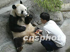 北京動物園八歲大熊貓“妞妞”8月24日生下一只幼崽后,經過十天母子平安。與“妞妞”朝夕相處的飼養(yǎng)員成功地實行“無間隔”近距離護理產后大熊貓,這在北京動物園是首次。中新社記者:任晨鳴