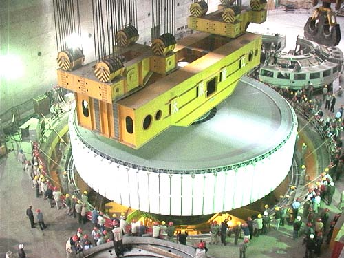 中新網(wǎng)9月6日電 重達(dá)1780噸的三峽左岸電站4號機(jī)組轉(zhuǎn)子今天順利吊裝就位。