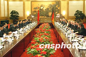 胡錦濤說,中德兩國人民有著長期友好交往的歷史,建交三十多年來,尤其是中國實(shí)行改革開放、德國重新實(shí)現(xiàn)統(tǒng)一后,兩國關(guān)系全面發(fā)展。兩國高層交往密切,雙方經(jīng)貿(mào)合作不斷擴(kuò)大。我們贊賞德國歷屆政府堅(jiān)持一個(gè)中國政策,保持對華政策的連續(xù)性,致力于中德友好。