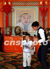 吉林省松原市郊的查干湖畔如今新建了許多觀(guān)光蒙古包,年幼的蒙古族男孩在中國(guó)元代英雄成吉思汗的肖像前持刀照相。成吉思汗的蒙古鐵騎大軍曾經(jīng)馳騁歐亞大陸而名垂青史。中新社記者:賈國(guó)榮