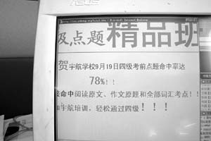 據(jù)《京華時(shí)報(bào)》報(bào)道,北京某高校剛剛參加完英語四級(jí)考試的小鮑反映,前天,不少同學(xué)在地質(zhì)大學(xué)看到當(dāng)晚在該校將舉行“四級(jí)考試考前點(diǎn)題培訓(xùn)”的海報(bào),入場(chǎng)券50元,舉辦方為北京宇航考試培訓(xùn)學(xué)校!斑@次培訓(xùn)點(diǎn)中了試題中大概50分的內(nèi)容!”