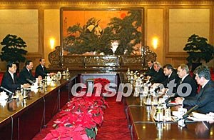 胡錦濤首先對上海合作組織總理會晤的成功舉行并取得重要成果表示祝賀。他說,這次會晤簽署及批準的《上海合作組織成員國多邊經(jīng)貿(mào)合作綱要》等文件,為六國經(jīng)濟合作奠定了重要法律基礎(chǔ),必將進一步推動區(qū)域經(jīng)濟合作,并為組織的兩個常設(shè)機構(gòu)如期啟動創(chuàng)造有利條件。