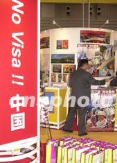 日本人赴中國短期旅行免簽證,成為招徠日本游客的新手段,十月三日在日本橫濱開幕的世界旅行博覽會上,中國展臺豎起了免簽證的宣傳牌。作者:王健