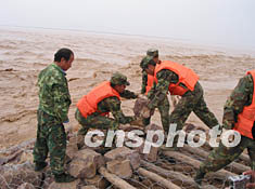 面對嚴(yán)峻形勢,黃河防總科學(xué)調(diào)度小浪底、三門峽、故縣、陸渾水庫,通過四庫聯(lián)調(diào),有效地削減了渭河5次洪水過程。但是由于黃河下游河道長時間過水,局部河段河勢發(fā)生變化,導(dǎo)致下游控導(dǎo)工程出現(xiàn)大量險情,特別是近年來在旱地上的新修工程。目前,蘭考至東明黃河大堤嚴(yán)重偎水,偎水長度近50公里。尤其是山東東明河段大堤1/2至2/3被洪水淹沒,洪水最深達(dá)6米,偎水深度創(chuàng)歷史最高,情況十分危急。
