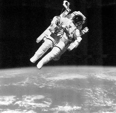 1984年6月7日,美國航天飛機(jī)“挑戰(zhàn)者”號宇航員布魯斯·麥坎德利斯使用載人機(jī)動裝置,離開航天飛機(jī)320英尺,完成了人類首次無安全索太空行走。新華社圖