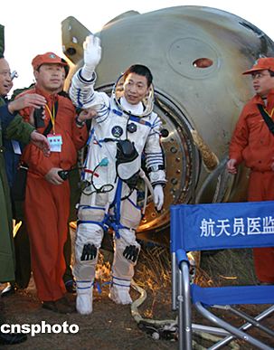 六時四十五分,身著白色宇航服的航天員從返回艙中神采奕奕探頭出來,他把面罩向上一拉,微笑著向迎接他回家的人們揮手致意。一時間、草原上掌聲雷動,許多人激動地流下了熱淚。