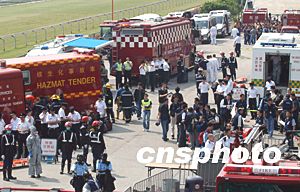 香港警方“雷霆”反恐演習10月24日在沙田馬場進行,演習模擬馬場受到沙林毒氣和爆炸裝置襲擊,警方和其它部門迅速到場處理,將傷者送往醫(yī)院。中新社記者:洪少葵