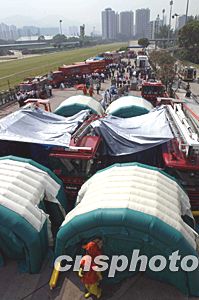 來自保安局、消防處、醫(yī)院管理局、醫(yī)療輔助隊、民安隊、天文臺、衛(wèi)生署和賽馬會共1300多人參與此次演習。中新社記者:洪少葵