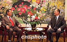 國(guó)務(wù)院僑辦副主任趙陽(yáng)(圖右)24日在重慶會(huì)見(jiàn)菲律賓著名華人實(shí)業(yè)家陳永栽,趙陽(yáng)表示,陳永栽先生投資設(shè)立的新聯(lián)商業(yè)銀行重慶分行將對(duì)重慶乃至西部地區(qū)經(jīng)濟(jì)發(fā)展起積極作用。作者:鄒輝