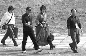 停車處與拍攝的大殿有幾百米距離,劉曉慶神態(tài)自若地與身邊人有說(shuō)有笑。她看上去只有35歲上下,扮相頗像當(dāng)年的“武媚娘”。不少游客從她對(duì)面走過(guò)時(shí),都沒(méi)認(rèn)出她就是劉曉慶。兩名專門從東陽(yáng)市保安服務(wù)公司聘請(qǐng)來(lái)的保鏢也無(wú)事可做,一路上幫著她的化妝師、助理拎包。直到走到大殿,劉曉慶發(fā)現(xiàn)早早埋伏的記者們舉著“長(zhǎng)槍短炮”,立刻變了臉色。保鏢和助理立刻高舉雙手阻止拍照。劉曉慶進(jìn)殿后兩名保鏢把守住前后大門。