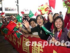 中國載人航天飛行代表團(tuán)團(tuán)長(zhǎng)胡世祥、副團(tuán)長(zhǎng)張慶偉及航天員楊利偉一行在港澳碼頭受到了澳門各界人士的熱烈歡迎,中央駐澳聯(lián)絡(luò)辦主任白志健以及澳門特區(qū)政府代表、運(yùn)輸工務(wù)司司長(zhǎng)歐文龍等到碼頭迎接。近千名澳門中小學(xué)生和各大社團(tuán)代表,打著橫幅、揮舞國旗和澳門區(qū)旗,夾道歡迎航天英雄的到來。當(dāng)楊利偉一行步出碼頭出境大廳時(shí),人群中爆發(fā)出一陣陣歡呼聲。四名小學(xué)生向胡世祥、張慶偉、楊利偉和總設(shè)計(jì)師王永志獻(xiàn)花,楊利偉等向歡迎人群揮手致意,并不時(shí)同人們握手,感謝澳門同胞的盛情。