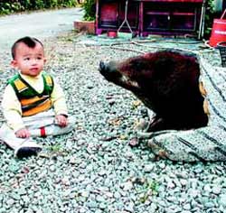 據(jù)臺灣聯(lián)合報報道,萬興村的萬墩巷成了”山豬巷”,居民閑暇不是聊山豬就是溜山豬,張勝雄家名叫”小豬”的山豬頗有個性,5個月大,不論睡覺或玩耍都要蓋被子。張?zhí)f,小豬的習性很奇特,親戚朋友聽到了還跑來一觀究竟,看到山豬躺在彈簧床上蒙著棉被睡大頭覺,不禁笑說”真有人性”。
