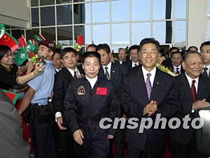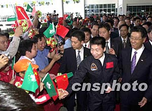 應(yīng)澳門(mén)特區(qū)政府的邀請(qǐng),國(guó)家首飛航天員楊利偉及中國(guó)載人航天飛行代表團(tuán)五日中午從香港乘船抵達(dá)澳門(mén)進(jìn)行訪問(wèn),澳門(mén)各界數(shù)百人在外港碼頭夾道熱烈歡迎。中新社記者:李剛